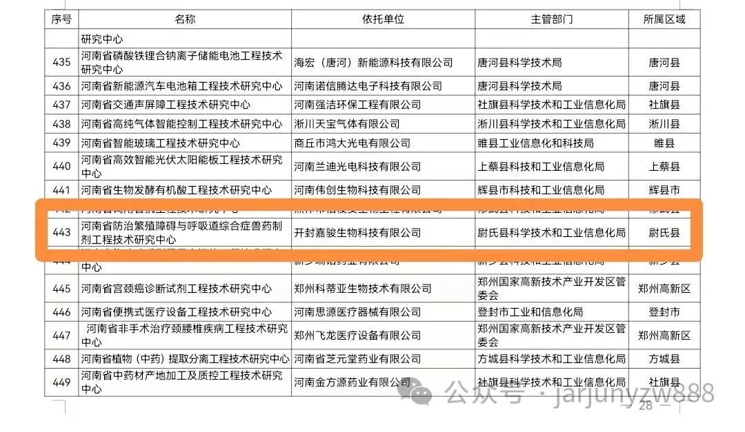 2024年1月4日,河南省科学技术厅官网公布了,《2023年度拟认定河南省工程技术研究中心名单》,嘉骏生物荣获“河南省防治猪繁殖障碍与呼吸道综合症兽药制剂工程技术研究中心”