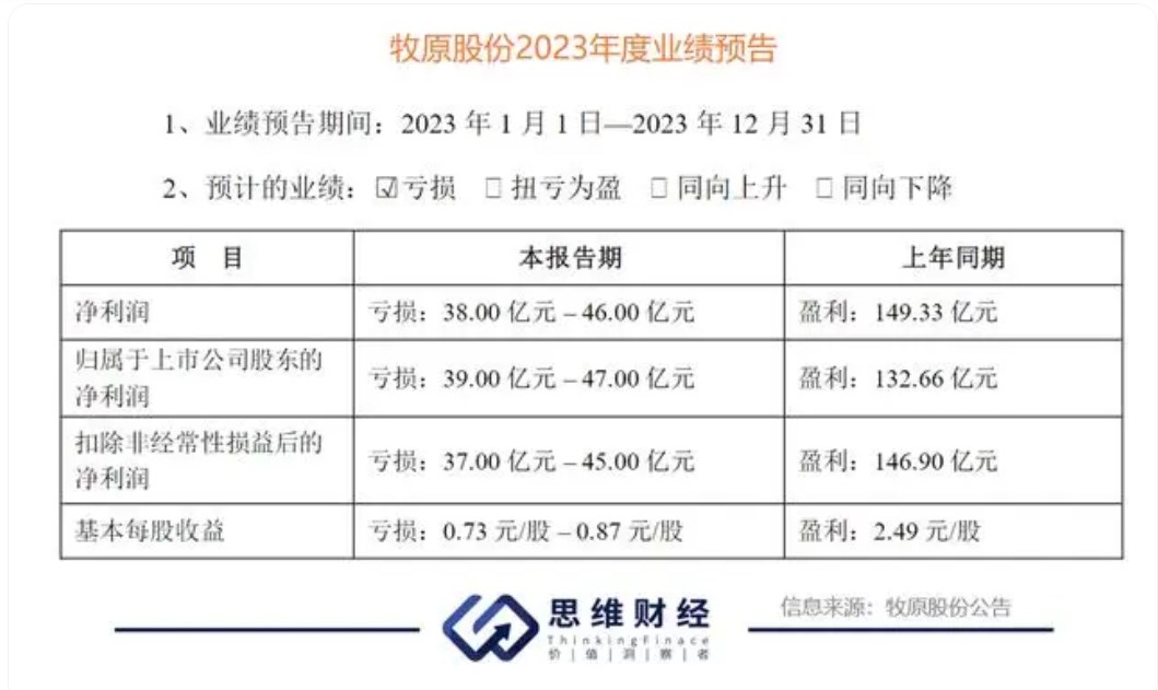 1月30日晚,牧原股份发布2023年业绩预告,预计2023年归母净利为亏损39亿元至47亿元。