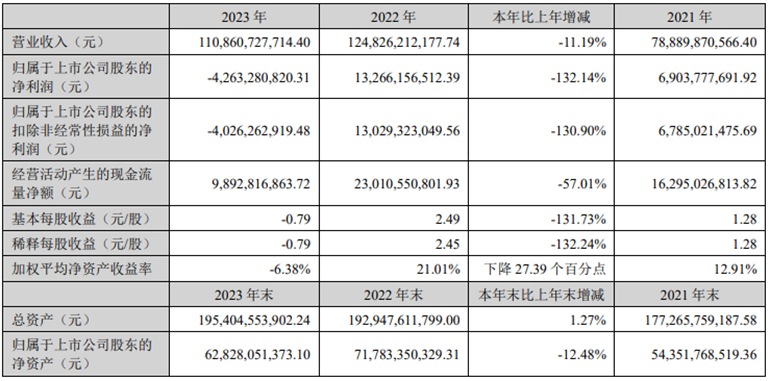 2023年公司实现营业收入1108.61 亿元,较上年同期减少11.19%,实现净利润亏损41.68亿元,同比减少127.91%。