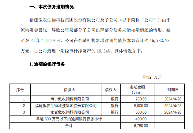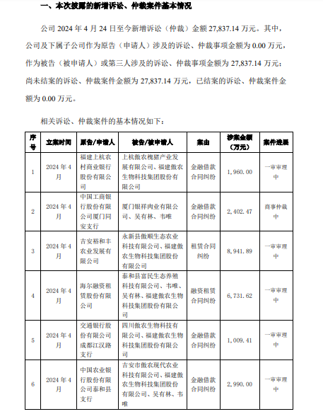 同日,傲农还分别公布了关于新增涉及诉讼、仲裁事项的公告以及关于新增部分债务逾期的公告。
