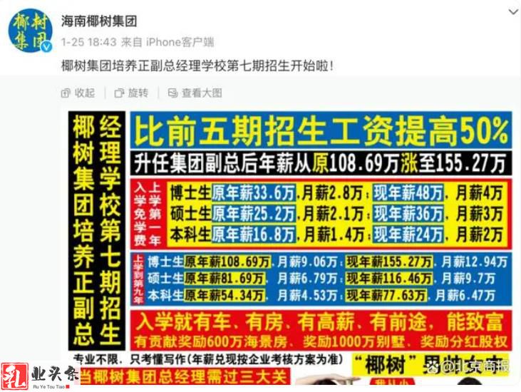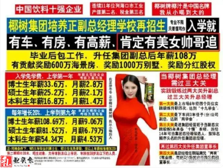 今年年初,椰树集团也曾因类似广告上热搜。配色大红大黄,加黑加粗艺术字满铺,醒目的广告标语:入学就有车、有房、有高薪、有前途、能致富。