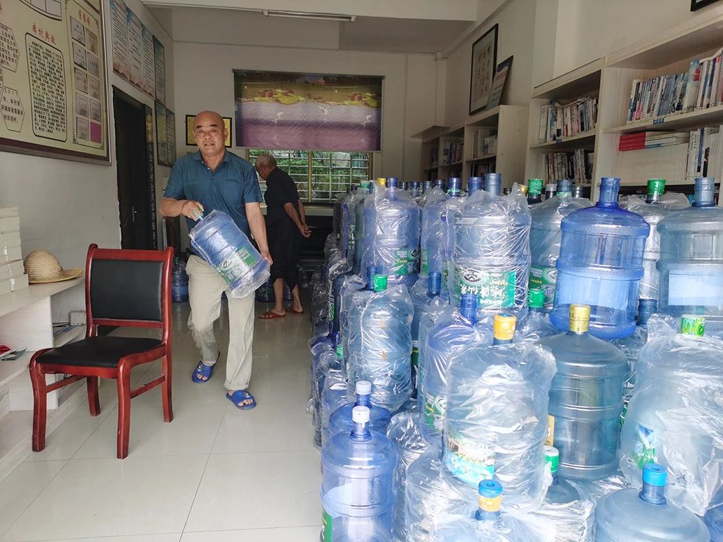 5月8日,澎湃新闻记者在八公分村的村部看到,工作人员送来的桶装水摆放在村委办公室旁边,不时有村民前来领水。“一桶有30多斤。”村民黄长茂说。74岁的他在这里负责登记,每户村民每天可领两桶纯净水。