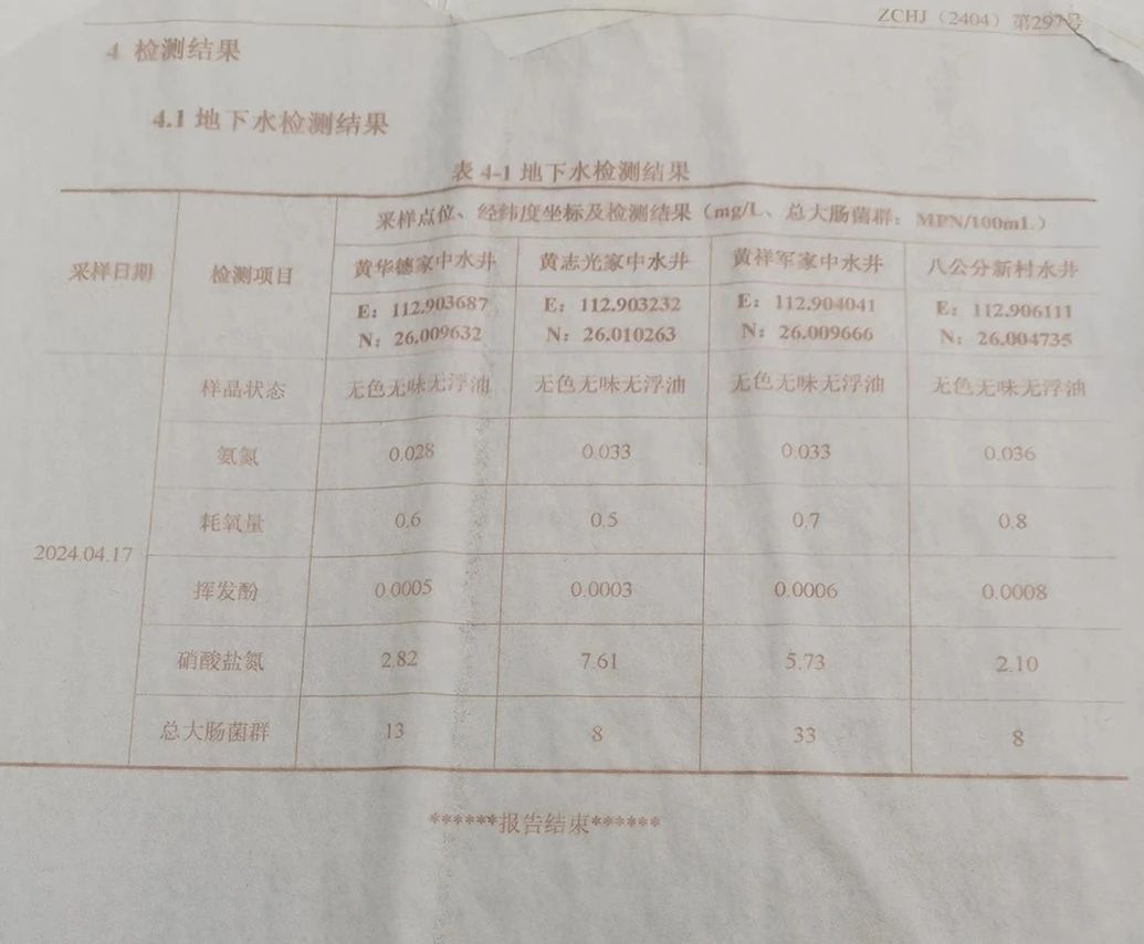4月16日,村民黄华德、黄志光从自家和村里老井取了水样,送到郴州市北湖区疾控中心检测。检验结果显示,三口井水的细菌总数、总大肠菌群均超标。
