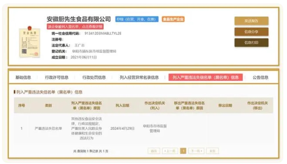 国家企业信用信息公示系统显示,春天食品、厨先生公司违反食品安全法律、行政法规规定,严重危害人民群众身体健康和生命安全的违法行为,被列入黑名单。东辉食品因生产经营的食品标签、说明书含有虚假内容,涉及疾病预防、治疗功能,或者生产经营保健食品之外的食品的标签、说明书声称具有保健功能,被列入黑名单。