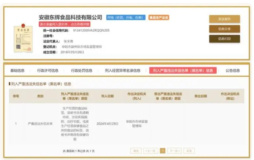 除行政处罚外,这3家公司还被阜阳市场监管局列入严重违法失信名单(又称“黑名单”)。