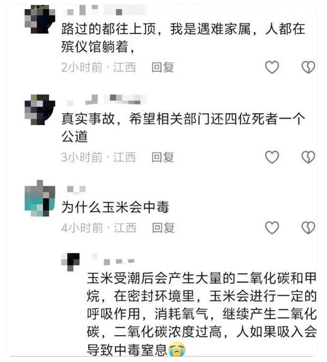 “都不知道短时间会产生这么大浓度的气体。”据该负责人初步了解,4人是因玉米受潮后产生气体过浓致死,“潮湿玉米发酵会产生这么高的气体浓度,造成人员现场突发意外,也是极端案例。”