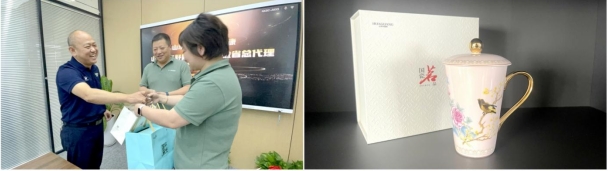 签约仪式结束后,刘洪新总经理代表公司,向张智、高智华夫妇以及尹传萍、何长久夫妇赠送了华光国瓷制作的千里江山系列华青瓷盖杯和芳华女神杯。