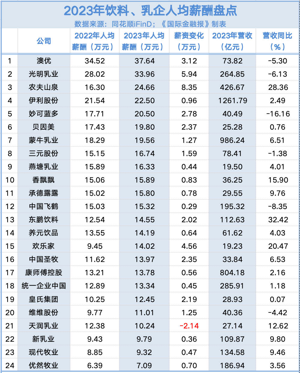 榜单显示,员工薪酬最低的三家公司为新乳业、现代牧业和优然牧业,人均年薪尚不足10万元,但这三家公司营收规模均超百亿元。其中,新乳业去年营收109.87亿元,同比增长9.8%,是下游乳企第五大上市公司,位于伊利、蒙牛、光明、飞鹤之后。另外两家是乳业供应链上游的龙头公司,现代牧业是蒙牛的原奶供应商,去年营收134.58亿元,同比增长9.46%;优然牧业是伊利的上游企业,去年营收186.94亿元。从人均薪资变动来看,25家企业中唯一一家“降薪”的是天润乳业,其人均薪酬由原来的12.38万降至10.24万元。去年,天润乳业营收27.14亿元,同比增长12.63%;归母净利润为1.42亿元,较同期下滑27.71%,是乳品下游端净利下滑较多的公司之一。
