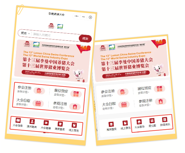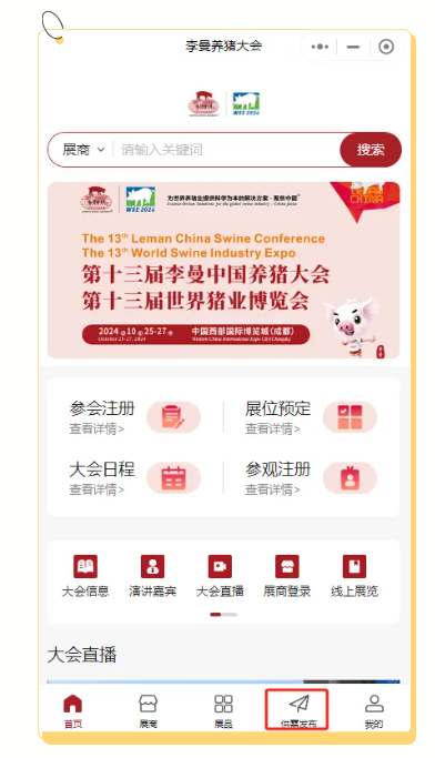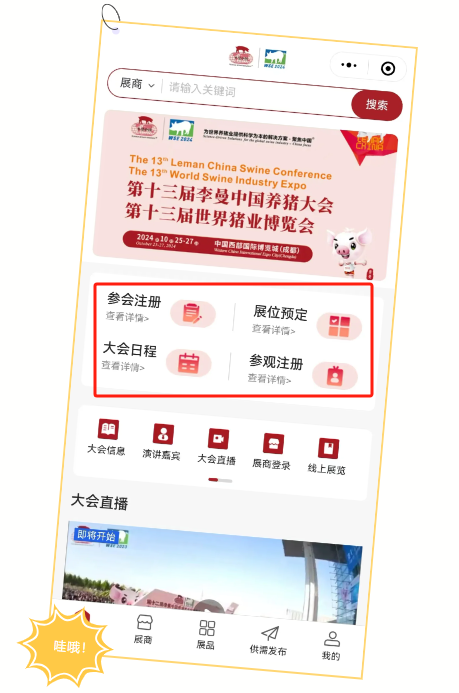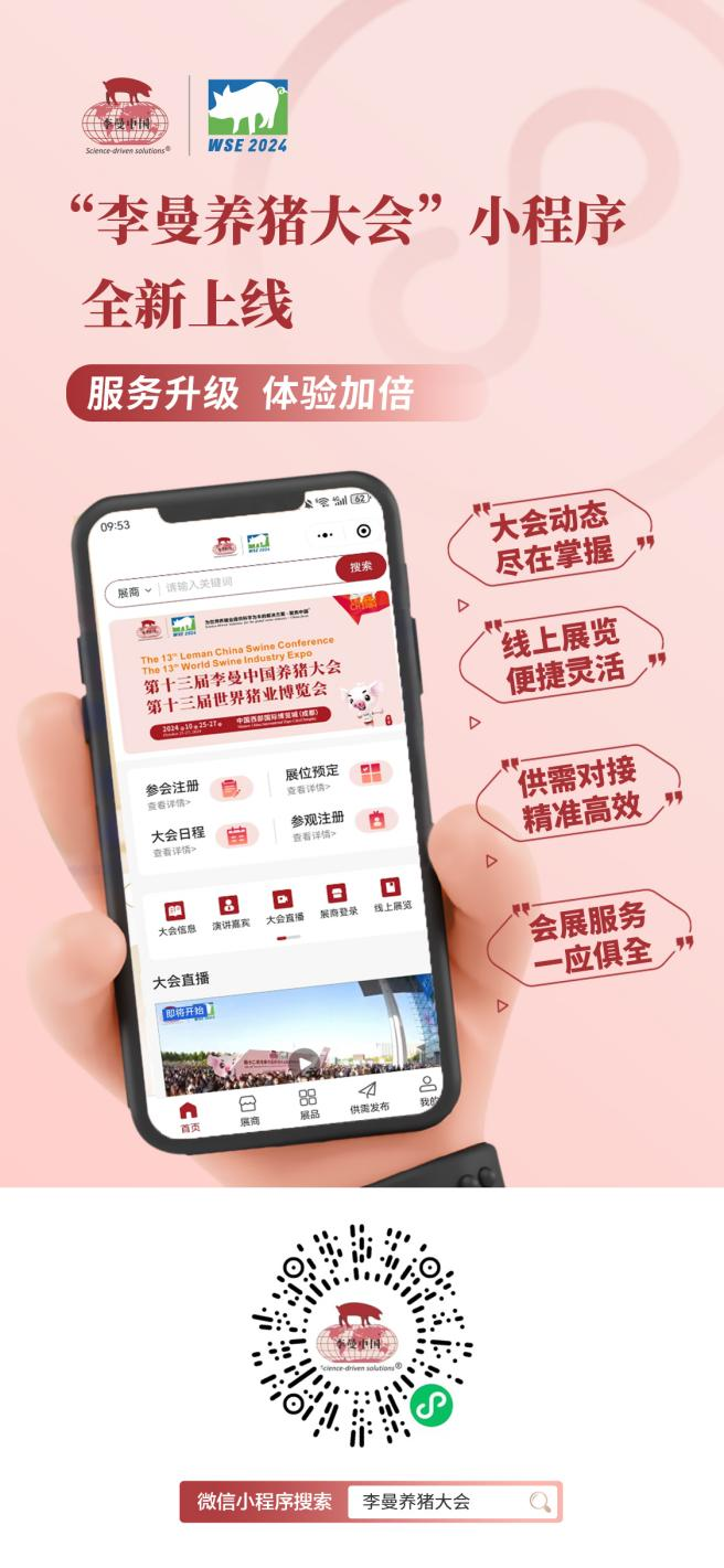 今年是李曼中国养猪大会焕新升级的一年,李曼中国养猪大会小程序正式上线。李曼大会小程序集成信息查询、线上展览、宣传推广、沟通洽谈、撮合对接、参会注册、参观登记、会场签到、观看直播、会员积分等多个功能模块,为广大参会代表、参展企业、专业观众等提供方便迅捷、十分贴心、多重福利等会展体验。