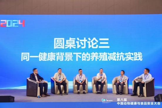 四川省动物疫病预防控制中心二级研究员王泽洲,华派生物技术(集团)股份有限公司董事长谢建勇,凤集食品集团副总裁徐文龙,瑞普生物技术服务中心总经理王友,梅特勒 托利多产品检测业务总经理余杰围绕同一健康背景下的养殖减抗实践主题展开讨论。国家动物健康与食品安全创新联盟副秘书长孙忠超博士主持了本场圆桌讨论。