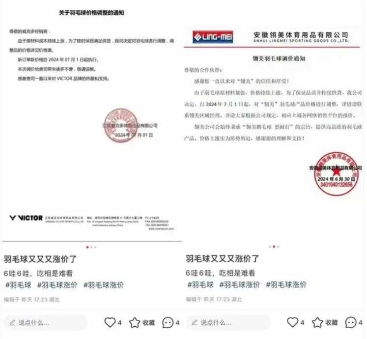 例如李宁在6月1日就进行了涨价动作,幅度为每筒3元-14元,旗下凯胜羽毛球的涨幅则为每筒2元-12元。