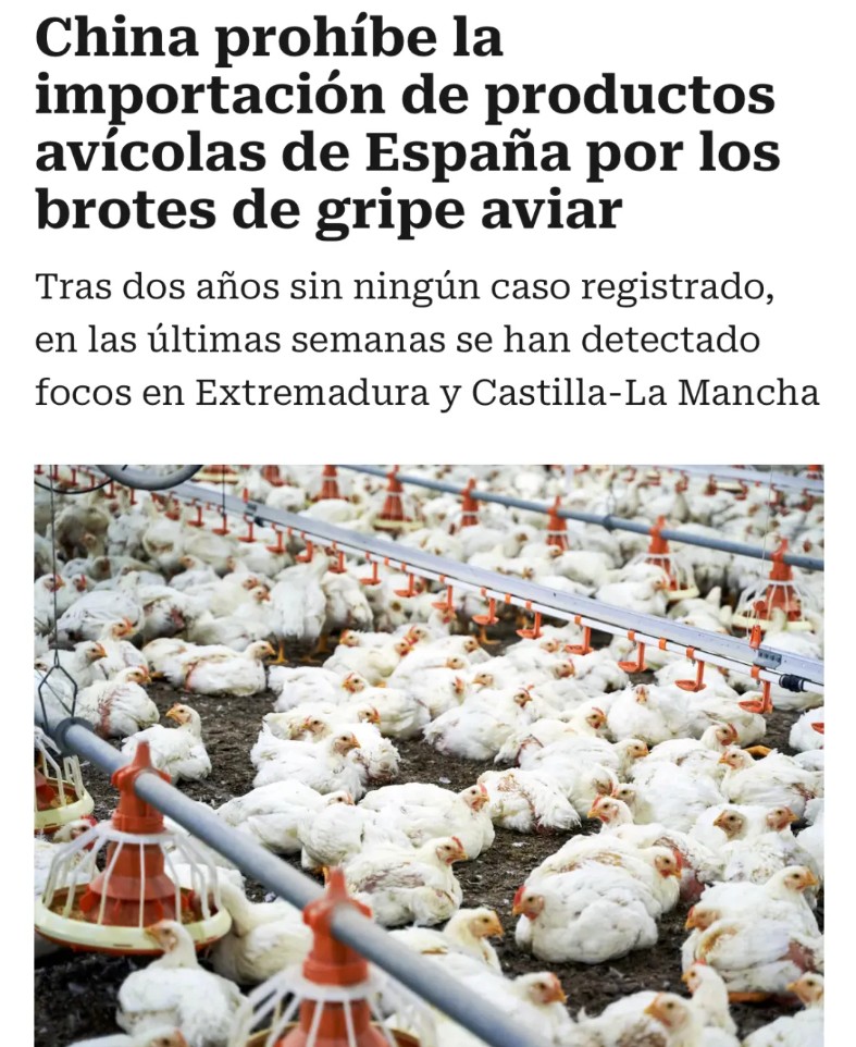 中国海关总署宣布,自8月7日起全面禁止直接或间接进口西班牙禽类及其制品,包括加工品,原因是西班牙多地近期暴发高致病性禽流感疫情。这一禁令出台前,双方才在4月签署禽类出口协议,原本计划开拓中国这一重要市场。疫情已在埃斯特雷马杜拉和卡斯蒂利亚-拉曼恰的养殖场出现,中国方面同时要求对来自西班牙的相关运输废弃物进行处理,违者将受处罚,禁令未设解除期限。