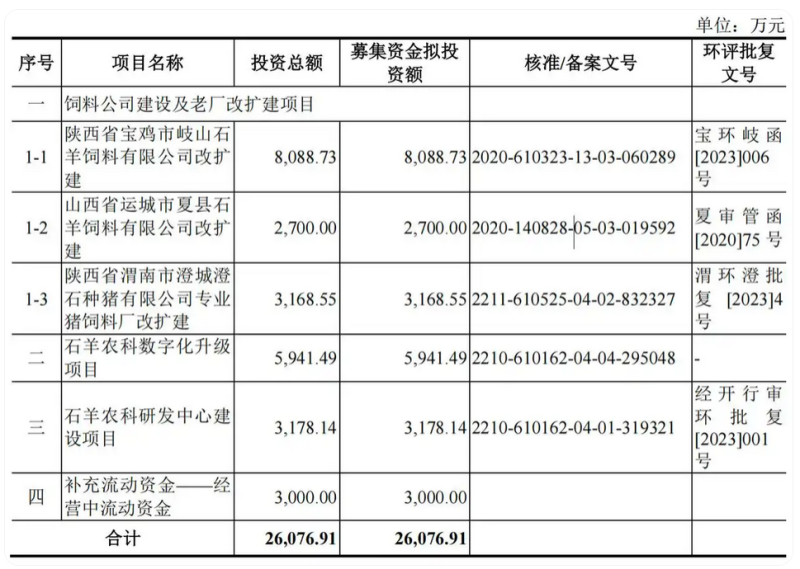此次IPO,石羊农科计划募资2.61亿元,其中近1.4亿元用于饲料公司建设及老厂改扩建项目、5941.49万元用于石羊农科数字化升级项目,3178.14万元用于石羊农科研发中心建设项目,3000万元用于补充流动资金。
