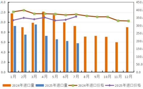 2025年7月,苜蓿干草进口5.8万吨,环比减少5.8%,同比减少37.0%;平均到岸价格356.96美元/吨,环比上涨6.2%,同比下跌3.9%。