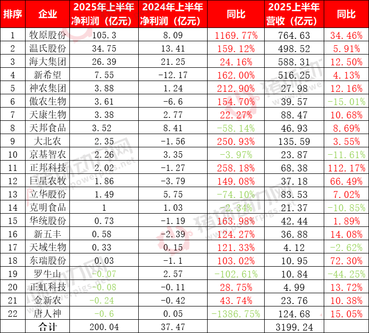 截止8月29日,所有上市猪企均公布2025年半年度业绩报告,大多企业净利润实现同比增长100%以上,更有企业最高净利润超过100亿元,可谓集体业绩爆发;但在一片红的大背景下,依然有4家企业出现亏损,让人唏嘘。