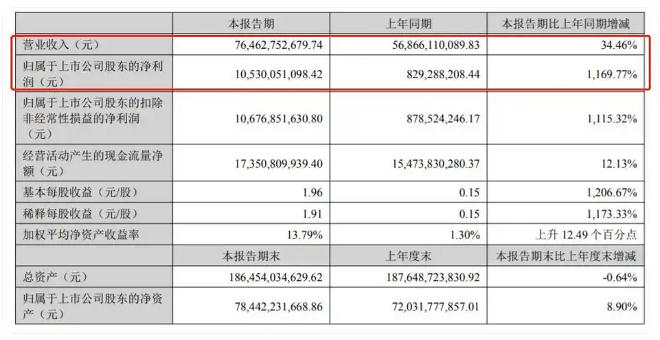 营收同比涨了34.46%,飙升至764.63亿元;净利润直接干到105.3亿元,同比暴涨了1169.77%。
