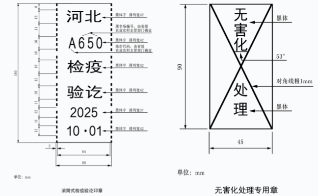 动物检疫标志变更:①检疫验讫印章包括滚筒式检疫验讫印章和无害化处理专用章。滚筒式检疫验讫印章可以在生猪胴体加施,印油颜色统一为蓝色;使用无害化处理专用章替代原有“高温”、“销毁”章,印油颜色统一为红色。