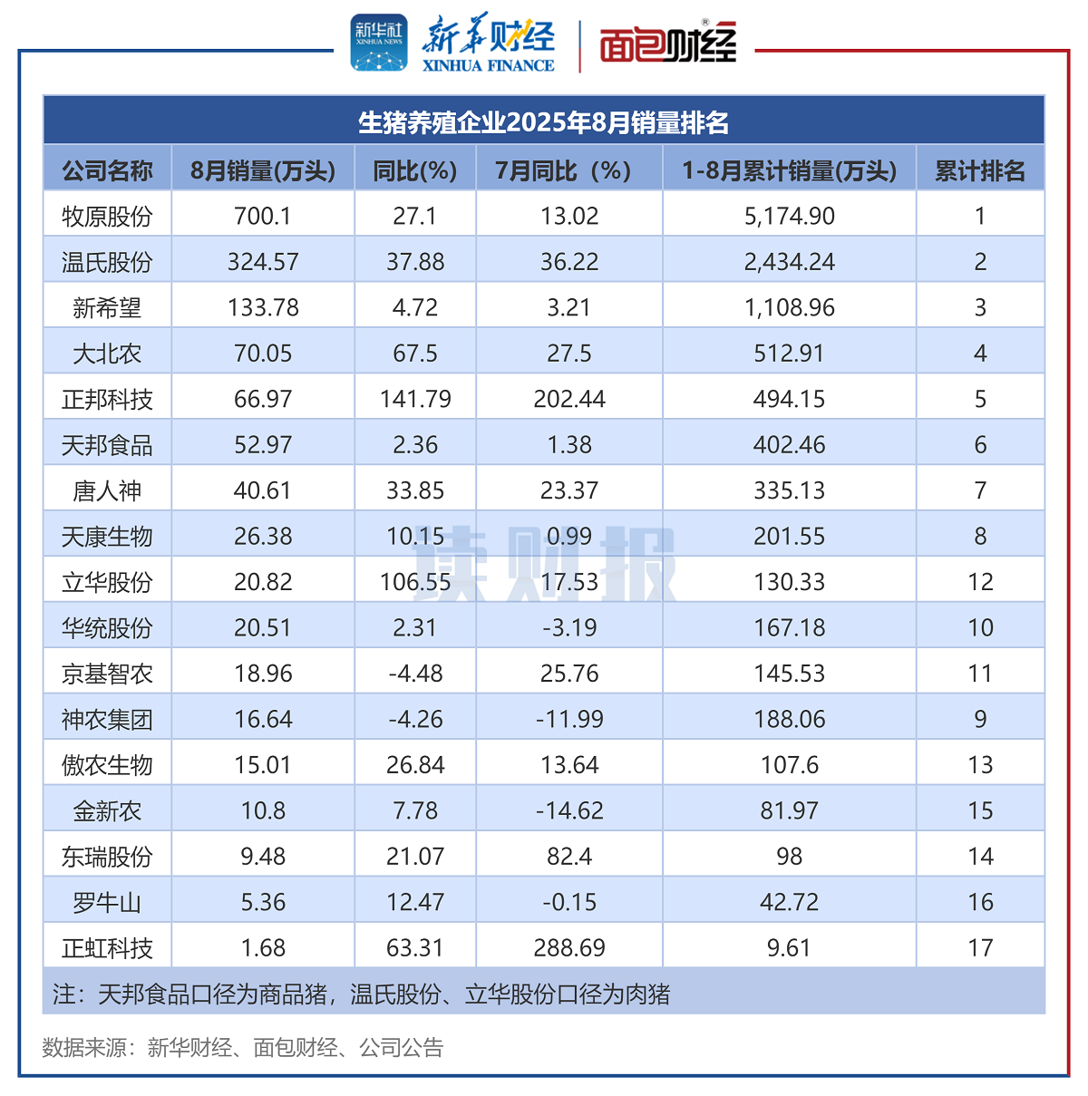 统计结果显示,2025年8月生猪养殖企业合计实现生猪销量1534.69万头,同比上升21.21%,环比上升6.91%。其中,牧原股份居首,销量达700万头,温氏股份、新希望的销量超过130万头,正邦科技、立华股份的月销增速超过100%。