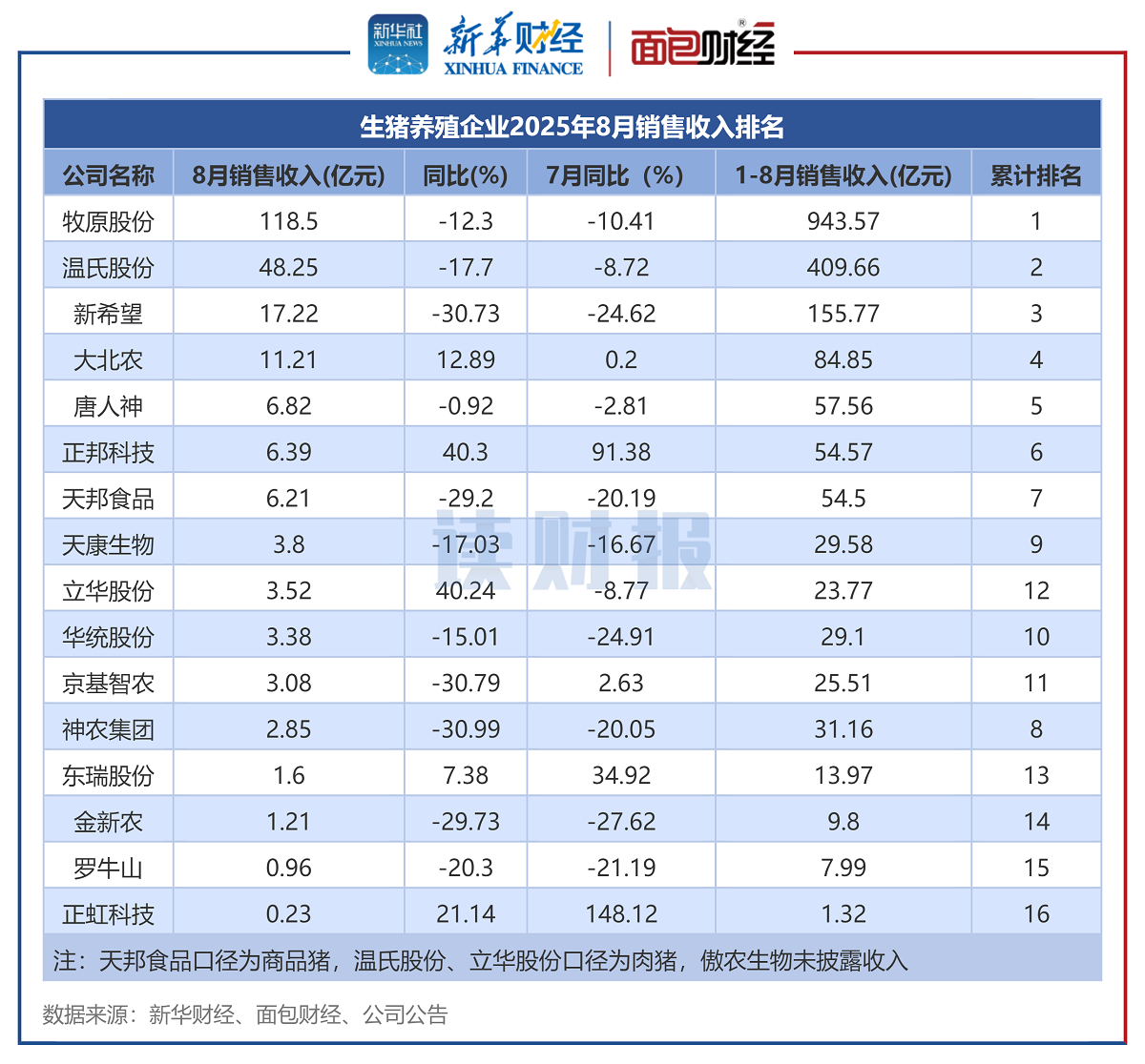 近期,生猪养殖企业8月的销售数据陆续披露。新华财经和面包财经研究员在剔除部分数据披露不全的上市猪企后,以沪、深两大交易所主要上市生猪养殖企业为样本,分别统计其生猪销售收入、销量。