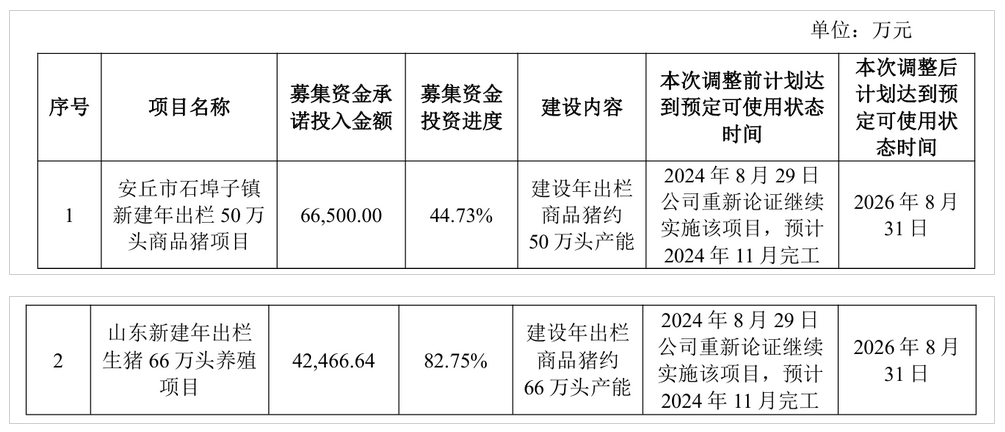 同日,龙大美食还宣布,对“安丘市石埠子镇新建年出栏50万头商品猪项目”和“山东新建年出栏66万头养殖项目”达到预计可使用状态的日期延长至2026年8月31日,同时对这两个项目进行重新论证。值得一提的是,这已非上述项目首次延期。