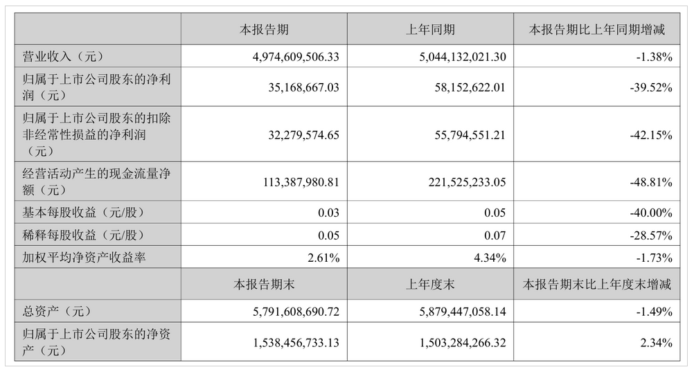 2025年上半年,公司实现营业收入49.75亿元,同比减少1.38%;归母净利润为3516.87万元,同比减少39.52%;扣非净利润为3227.96万元,同比减少42.15%。