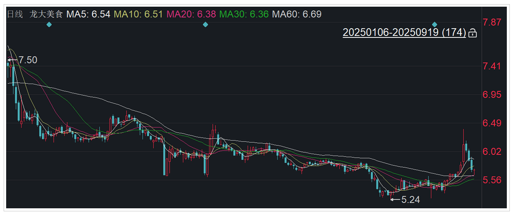 二级市场上,截至9月19日收盘,龙大美食报5.72元/股,最新市值61.73亿元,今年来公司股价累计下跌近三成。