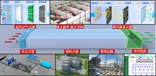 在牧原,做了空气过滤猪舍。进风端的四层空气过滤,让猪舍内每一个栏位、每一个圈都有独立新风、独立空间,做到非洲猪瘟等重要疾病,在栏位和栏位之间不会轻易传播。在出风端进行灭菌除臭,切断病毒在猪舍之间的传播。