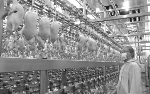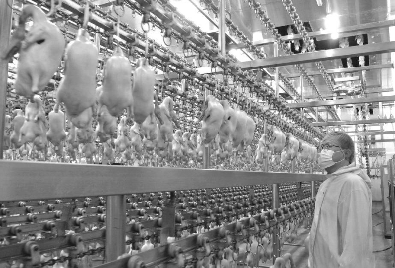 走进全封闭的现代化鸭坯加工车间,只见自动化生产线平稳运行,一只只肉鸭整齐悬挂在传送带上,依次完成宰杀、脱毛、晾坯、预冷等工序。“这是我们今年5月全新投产的车间,每天可处理3万只肉鸭。”公司生产经理助理孙杰说。