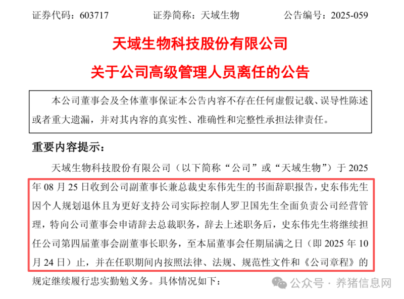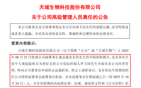与天邦食品相比,天域生物的变动更为剧烈和彻底。8月27日,天域生物连发两则公告,披露公司高级管理人员变动及实际控制人变更事宜。公告显示,公司原副董事长兼总裁史东伟因个人规划退休及支持控制权调整,辞去总裁职务,同时与原共同实控人罗卫国解除一致行动关系并放弃所持股份表决权,罗卫国成为公司唯一实际控制人。