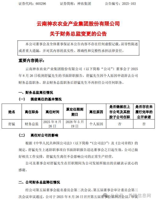 8月26日,神农集团发布公告称,舒猛先生因个人原因申请辞去公司财务总监职务。同时,公司于2025年8月26日召开第五届董事会第四次会议,同意聘任闫瑾先生担任公司财务总监。