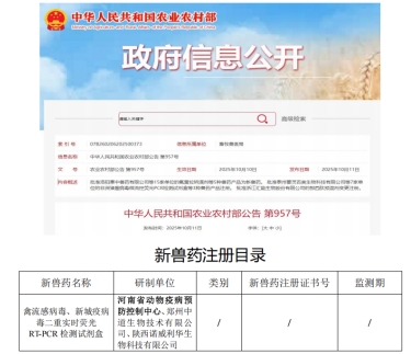 2025年10月11日,农业农村部公告第957号发布,河南省动物疫病预防控制中心作为第一完成单位自主研发的“禽流感病毒、新城疫病毒二重实时荧光RT-PCR检测试剂盒”通过农业农村部新兽药产品注册批准,该试剂盒是国内首个实现快速鉴别诊断禽流感、新城疫病毒野毒株的新产品。