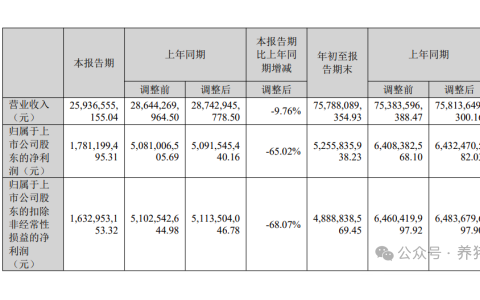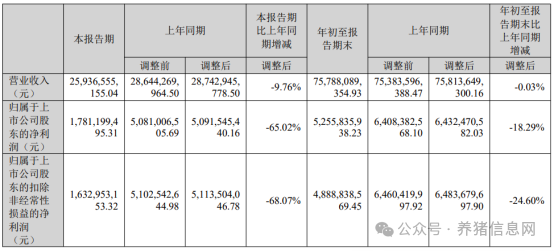 10月21日晚,国内生猪养殖领军企业温氏股份发布2025年第三季度报告,前三季度公司实现营业收入757.88亿元,同比下降0.03%; 归母净利润为52.56亿元,同比下降18.29%。其中,第三季度营业收入为259.37亿元,同比下降9.76%;归母净利润为17.81亿元,同比下降65.02%。