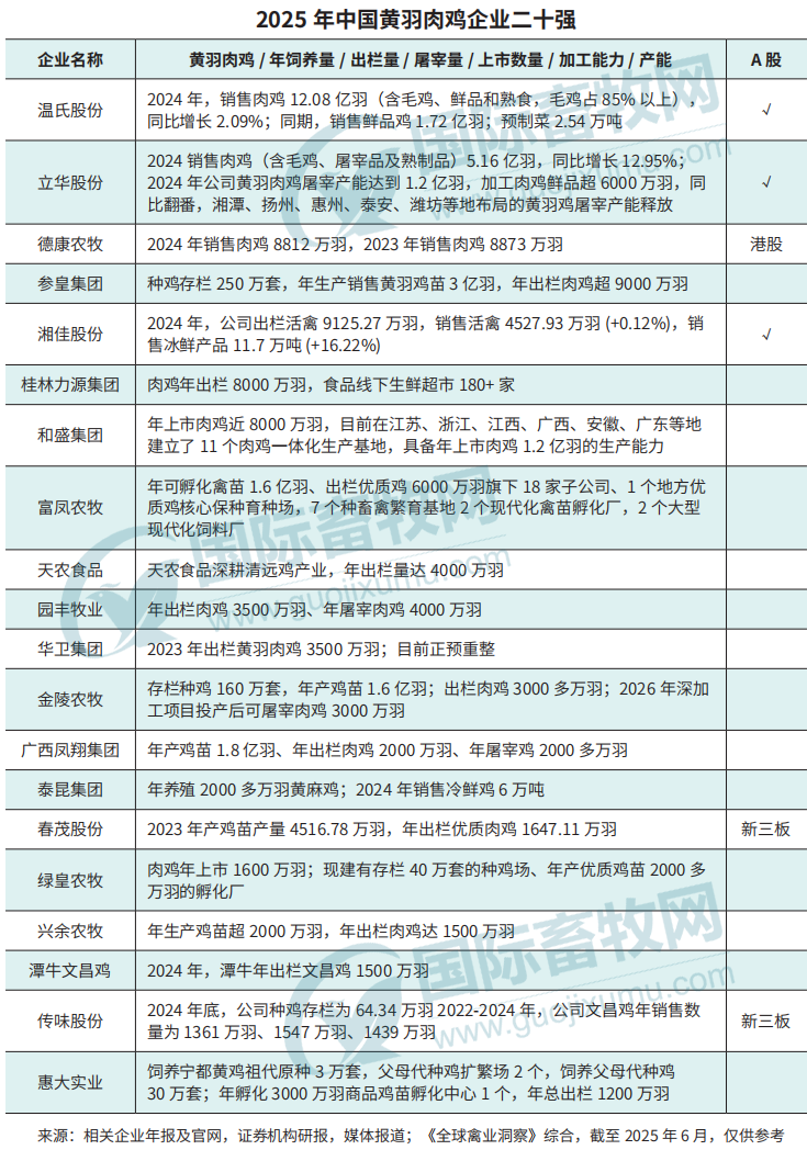 2025年中国黄羽肉鸡企业二十强出炉