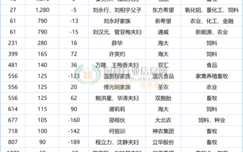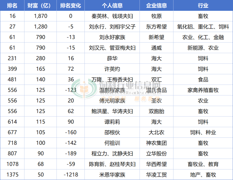 上榜的农牧企业富豪共16位,榜首是牧原股份的秦英林、钱瑛夫妇,财富涨幅39%,以1870亿元财富位列全国第16位,成功跻身全国Top20。其次是东方希望的刘永行、刘相宇父子以1280亿元财富位列第二,新希望刘永好家族和通威的刘汉元、管亚梅夫妇均以790亿元财富位列第三。海大上榜人数最多,分别是薛华、许英灼和谭莉莉。