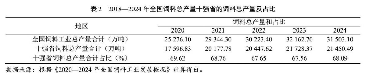 2020—2024年,饲料总产量十强省比较稳定,分别是山东、广东、广西、辽宁、河南、河北、四川、湖北、江苏和湖南。山东省饲料总产量一直位居全国第一,2024年高达4648.08万吨。饲料总产量十强省与养殖业大省身份基本匹配。十强省饲料总产量占全国总产量的比重较高,平均比重近70%,2024年占比为68.09%,详见表2。