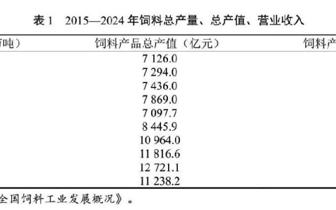 中国饲料总产量总体保持增长态势,但部分年份会受到各种因素影响而导致产量下降。2015—2024年,饲料总产量从20009万吨增长到31503.1万吨,增幅高达57.44%。这与居民对肉、蛋、奶类食品需求上涨密切相关。2019年受全球经济大环境及非洲猪瘟疫情的影响,饲料产品产值和营业收入都有所下降,分别为7097.7亿元和6858.5亿元,详见表1。2020年开始,随着猪瘟疫情好转,饲料产品总产值和营业收入开始回升。但是2024年饲料总产量、饲料产品总产值以及饲料产品营业总收入均下降,都低于2023年,主要原因是饲料行业正处于“洗牌”阶段,这反映出整个行业正在从“规模扩张”阶段向“提质增效”阶段深刻转型。