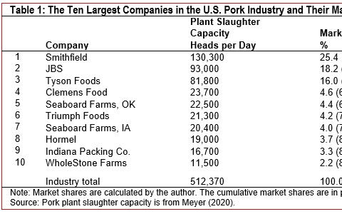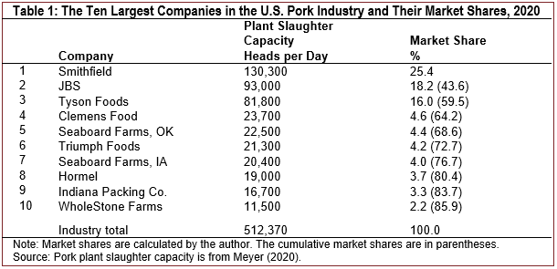 美国猪肉行业呈现集中化特征,即少数几家大型猪肉加工企业掌控了国内猪肉生产与销售的大部分份额。史密斯菲尔德食品(Smithfield Foods)、JBS美国(JBS USA)和泰森食品(Tyson Foods)是三大猪肉加工企业,2020年它们的生猪屠宰市场份额分别为25.4%、18.2%和16.0%。紧随其后的是一批规模较小的猪肉加工企业,市场份额在2.2%至4.6%之间。2020年,十大猪肉加工企业的合计市场份额达85.9%。