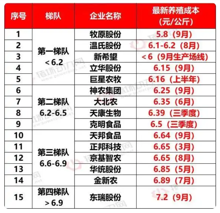 作为头部企业,牧原股份的成本控制极为出色,据BT财经不完全统计,目前牧原、温氏、新希望等15家上市猪企平均养猪成本为6.44元/斤,五成企业成本低于6.5元/斤。其中成本最低的是牧原股份,牧原股份凭借5.8元/斤的极致成本,已率先闯入“5元区间”,成为行业新标杆。