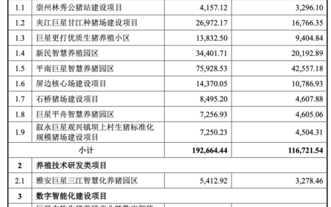 巨星农牧调整的相关定增方案,最初预案于2023年12月23日公布,拟募资不超过17.5亿元,计划投资的项目包括4大类,其中生猪养殖项目就有9项,总投资19.27亿元,拟使用募资11.67亿元,拟补流资金也高达3.5亿元。