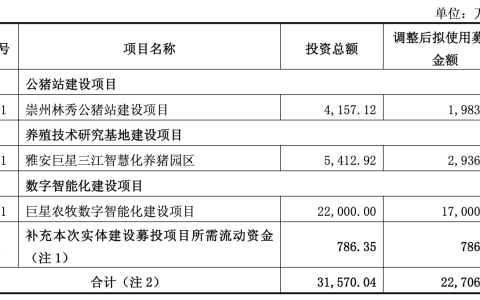 调整后,募集资金将集中用于公猪站建设、养殖技术研究基地建设、数字智能化建设以及补充少量流动资金。