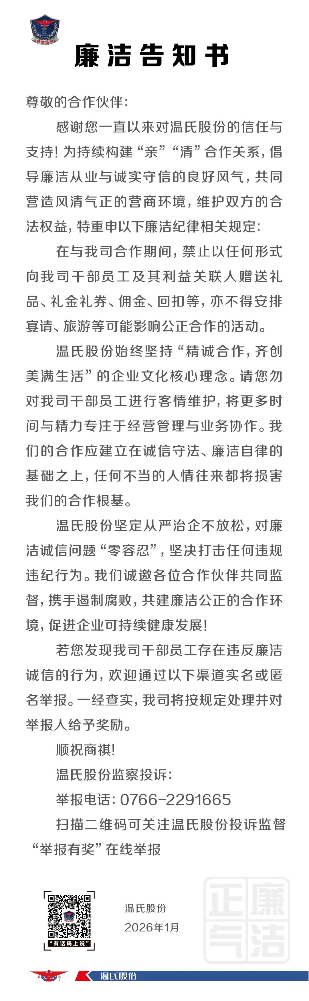 1月14日,温氏公开发布一封《春节廉洁告知书》。