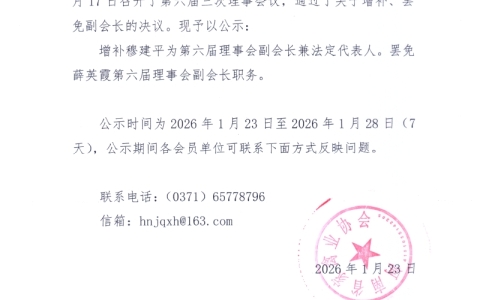 河南省家禽业协会第六届三次理事会议 关于增补、罢免副会长的公示