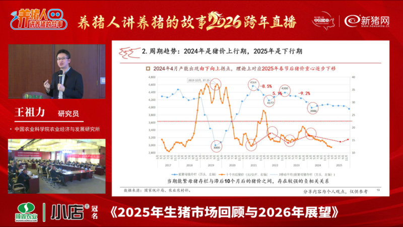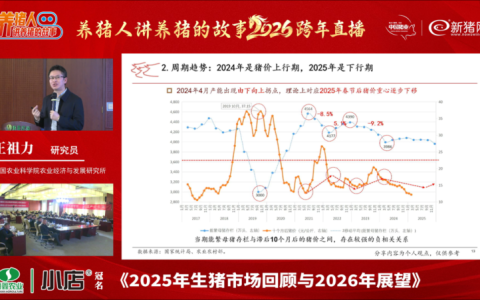 2026年1月25日,中国农业科学院农业经济与发展研究所、国家生猪产业技术体系产业经济研究室王祖力,在“养猪人讲养猪的故事2026跨年直报活动”中分享《2025年生猪市场回顾与2026年展望报告》,结合2025年行业运行数据与产业变化,对2026年猪价行情作出精准预判,并对行业风险作出重点警示。