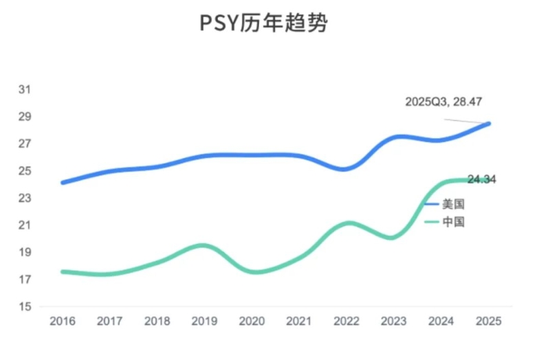 这也是微猪科技连续第10年发布年度数据报告。过去十年间,中美两国的PSY差距已从6.56头缩小至3.22头。国内头部企业已超美国均值,但较其顶尖水平仍有约5头的差距。