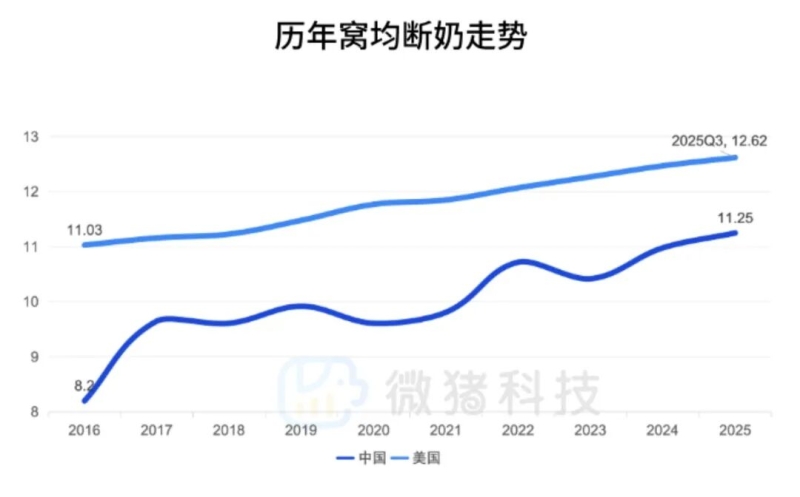 而从历年中美窝均断奶趋势看,两国增长模式迥异:美国稳中缓升,中国阶梯快追。绝对差距已从2016年的近3头持续收窄至2025年的约1.4头。
