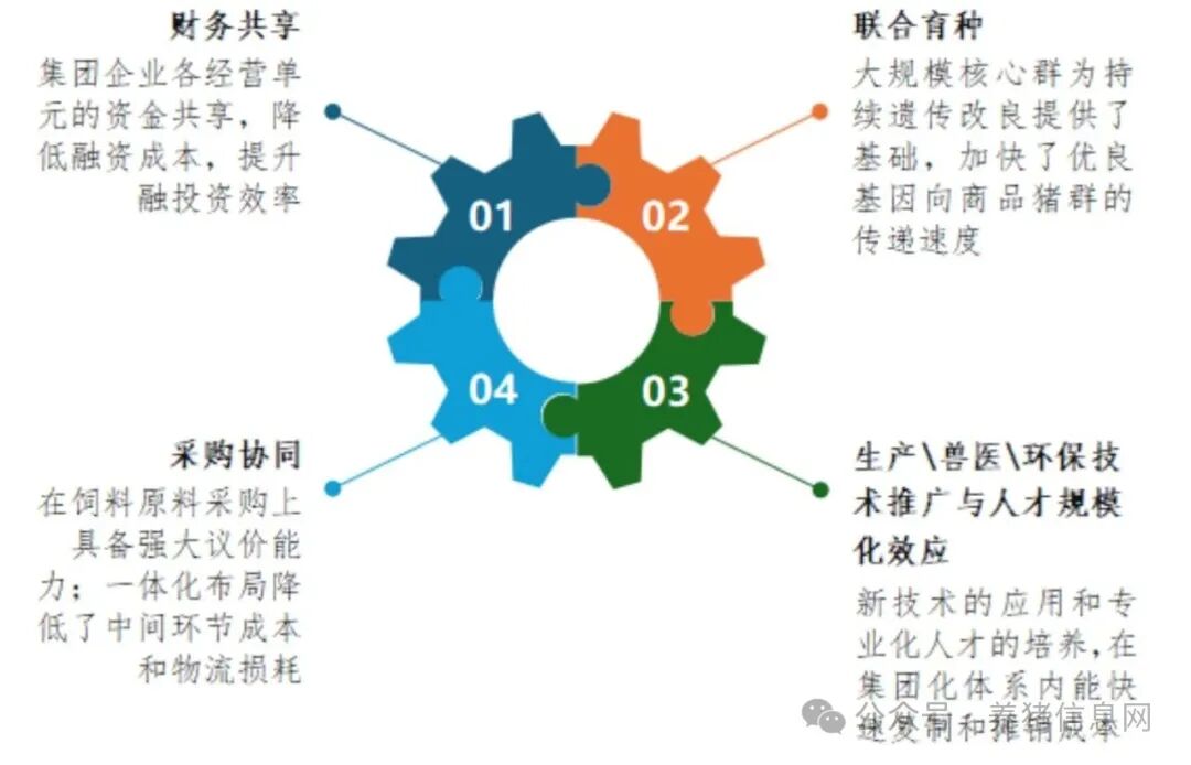 关键资源的整合能力是竞争核心。养殖技术来源上,头部企业特别重视快速引进行业前沿技术、快速在本体系验证和推广,同时不断升级改进生产和健康管理等模式,形成了领先于行业的技术体系。种源方面,在持续进口少量纯种猪的同时,自主育种成为各大龙头企业的战略焦点;也有头部企业与先进的种猪公司形成牢固的战略联盟,`花钱买进展`,快速在商品猪成本上得到体现。产业链纵向一体化成为普遍选择,向饲料、屠宰、食品加工延伸,在掌控养猪生产成本的同时,获得更大的产品收益。