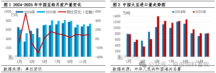 2025年豆粕产量在原料宽松的主要支撑下同比有所增加,月度产量基本随大豆供应水平变化,低点出现在4月,高点出现在8月。进入2026年,国内需求支撑及国际丰产基础上大豆进口或仍处高位,中国豆粕产量存在继续走高预期,或限制豆粕价格上方空间。