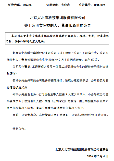 大北农2月4日盘后沉痛公告,公司实际控制人、董事长邵根伙先生于2026年2月3日因病逝世,享年60岁。公司各位董事、高级管理人员及全体员工对邵根伙先生的逝世表示深切哀悼和缅怀!