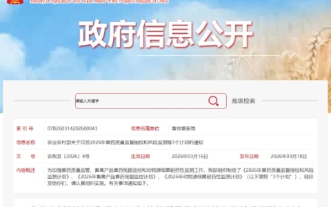 近日,为强化兽药质量监管、畜禽产品兽药残留管控以及动物源细菌耐药性监测,确保畜牧养殖生产、动物源性食品、公共卫生和生物安全,我国农业农村部发布了《2026年兽药质量监督抽检和风险监测计划》、《2026年畜禽产品兽药残留监控计划》、《2026年动物源细菌耐药性监测计划》。