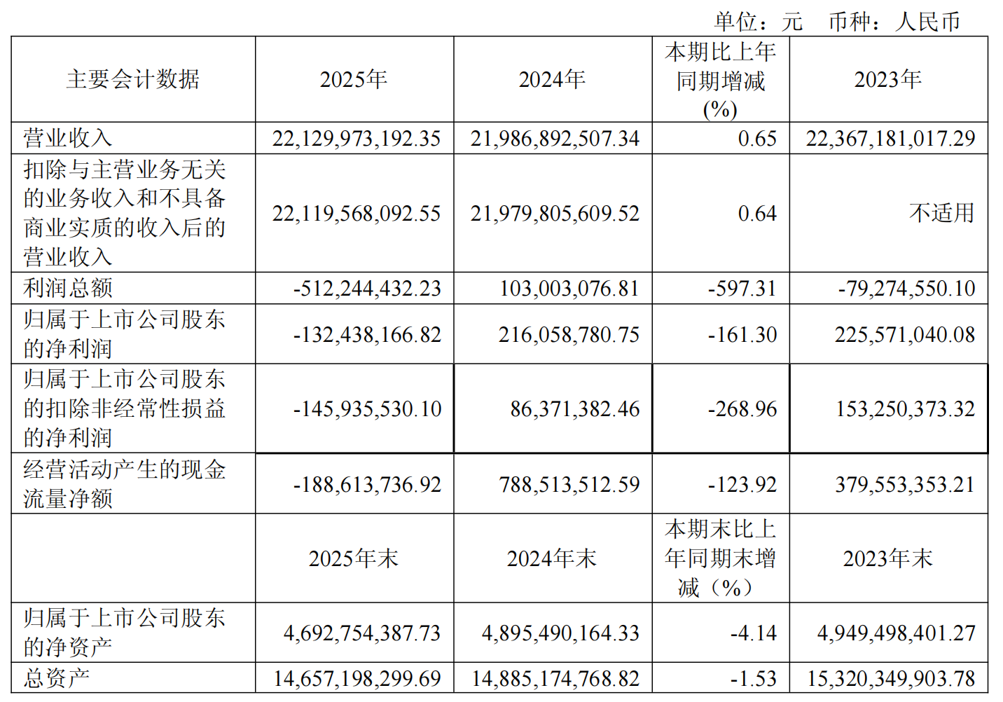 3月30日,光明肉业(600073)披露年报,2025年,公司实现营业收入221.30亿元,比上年度219.87亿元同比增加1.43亿元,增幅0.65%;归母净利润-1.32亿元,比上年度2.16亿元减少3.48亿元,降幅161.30%;扣非净利润-1.46亿元,比上年度8637.14万元减少2.32亿元,降幅268.96%;实现每股基本收益-0.14元/股,较上年度0.23元/股减少0.37元/股。
